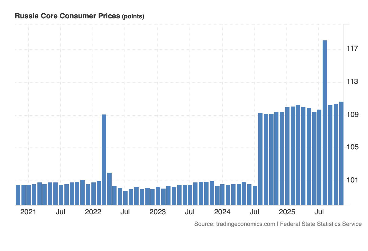 The second part of the year was marked by the collapse of Urals oil prices combined with the first direct Western sanctions on Russia’s oil majors, Lukoil and Rosneft. The pressure on the state budget, which relies heavily on oil sales and prices, was aggravated by Ukrainian kinetic sanctions, drone strikes on refineries and other energy nodes, critical for production. To cover the gap, the government drew heavily from the National Wealth Fund, which shrank to just $35 billion (liquidities) by late 2025, down from $135 billion at the start of the war. Fiscal reform continued with President Putin signing a landmark law raising the VAT from 20% to 22%, effective January 1, 2026. Alongside the VAT hike, the threshold for small and medium enterprises to qualify for the “Simplified Tax System” was slashed from 60 million to 10 million rubles, effectively forcing thousands of small businesses into the high-VAT regime.