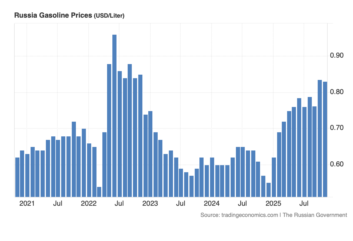 A doua parte a anului a fost marcată de prăbușirea prețurilor petrolului Ural combinată cu primele sancțiuni occidentale directe asupra giganților petrolieri ai Rusiei, Lukoil și Rosneft. Presiunea asupra bugetului de stat, care depinde în mare măsură de vânzările și prețurile petrolului, a fost agravată de „sancțiunile cinetice” ucrainene, atacurile cu drone asupra rafinăriilor și altor noduri energetice critice pentru producție. Pentru a acoperi deficitul, guvernul a apelat masiv la Fondul Suveran, care s-a redus la doar 35 de miliarde de dolari (lichidități) până la sfârșitul anului 2025, de la 135 de miliarde de dolari la începutul războiului. Reforma fiscală a continuat, președintele Putin semnând o lege ce majorează TVA-ul de la 20% la 22%, cu efect de la 1 ianuarie 2026. Alături de majorarea TVA, pragul pentru ca întreprinderile mici și mijlocii să se califice pentru „Sistemul de Impozitare Simplificat” a fost tăiat de la 60 de milioane la 10 milioane de ruble, forțând efectiv mii de afaceri mici să intre în regimul de TVA ridicat.