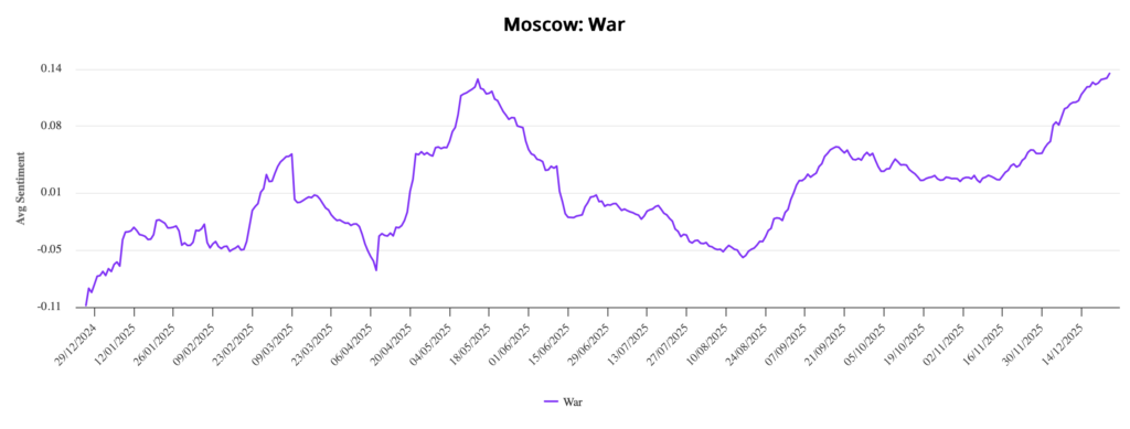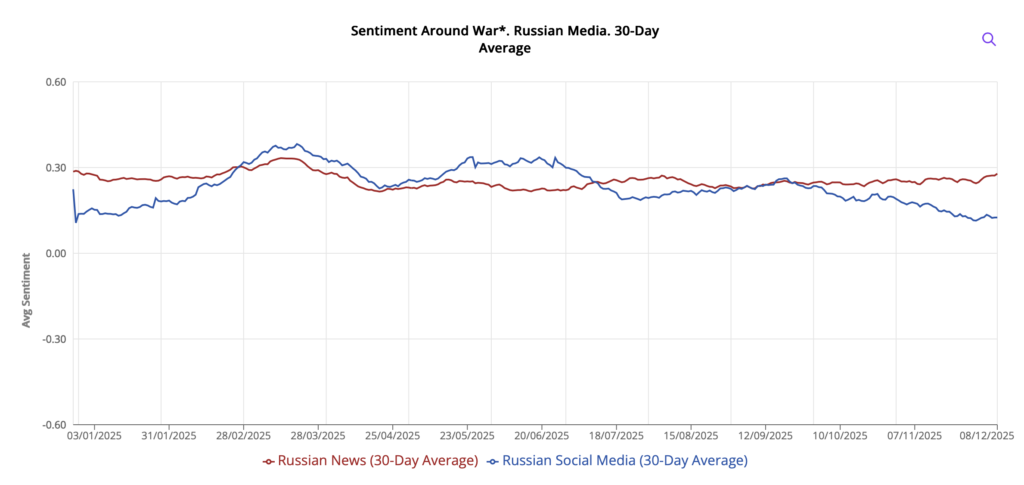 The Russians managed to seize Toretsk in July and increase their gains towards the strategic city of Pokrovsk. In August, President Trump hosted Vladimir Putin in Alaska. The summit did not yield any tangible results but it did benefit the Russian president, as it legitimized him as capable to negotiate directly with the United States, on U.S. soil. These events have probably been behind the slow increase of positive sentiment towards the war up until late September (for social media posts). Around the 22th of September, the graphs for social media and news media see their final inflection of the year, with news media continuing a relatively constant evolution, while social media sentiment towards the war sees a downward trend up until the end of the year.