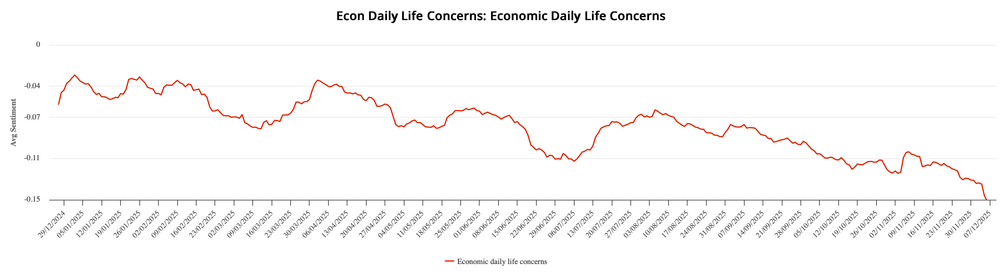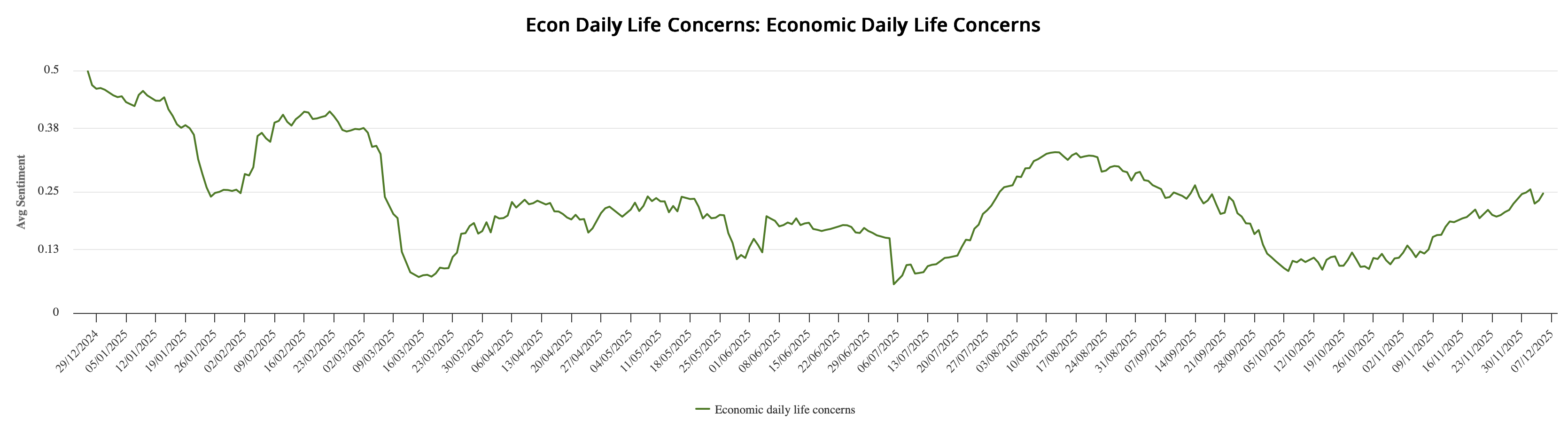 - Sentimentul privind economia este pe o tendință generală negativă cel puțin de la începutul anului 2025, în timp ce sentimentul privind războiul este pe o tendință generală negativă cel puțin din al doilea trimestru al anului 2025;