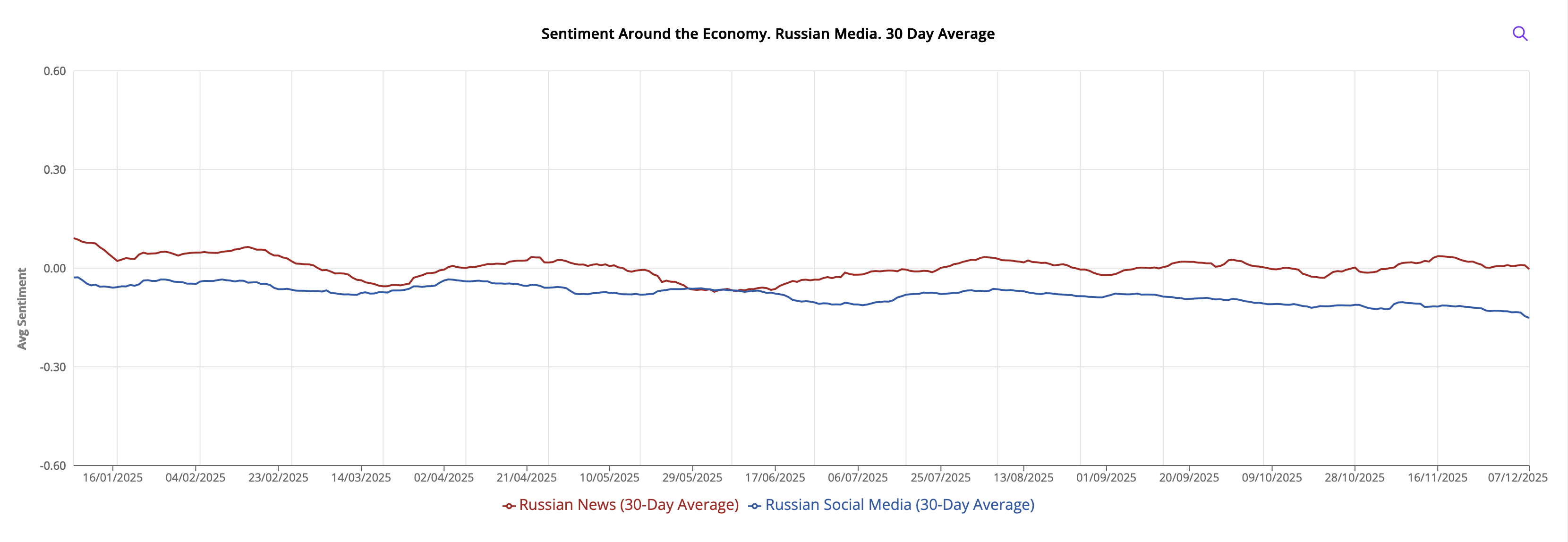 The big picture outlook of the Russian socio-economic situation in 2025 could also be described by a few keywords: military keynesianism, labor shortages, guns vs. butter, sanctions, suppression of dissent, political consolidation. Because there is relatively little fluctuation during 2025, we will split the analysis in two parts, for each half of the year. For a more granular view of the sentiment towards the economy based on social media posts alone, see figure 4, below. Here it is more readily visible that the trend was negative all year round, with the maximum score registered on January 3rd (-0,0291) and the lowest score registered on December 7th (-0,1512).