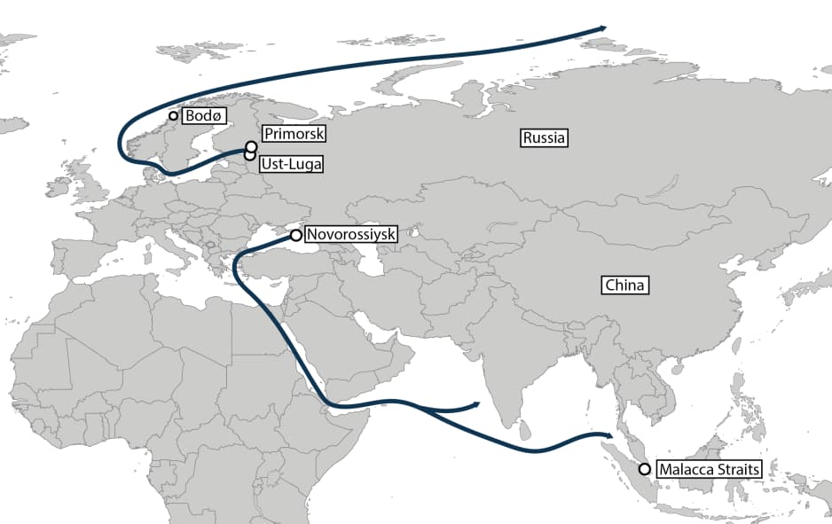 Rutele maritime către Asia pentru transporturile de petrol din Novorossiisk, precum și din Primorsk și Ust-Luga. (Sursa: HIGH NORTH NEWS)