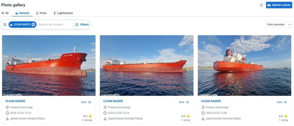 Poze oferite de platforma Marine Traffic cu petrolierul CLEAN RAIDER (IMO 9425318) acorat în portul grecesc Pireu (20 octombrie 2025). (Sursa: Marine Traffic)
