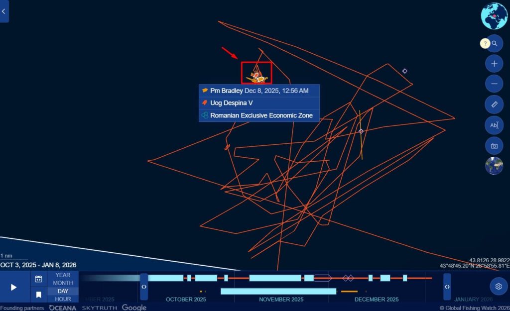 Un alt caz suspect este prezența în ZEE a României a petrolierului KONGUR (fost Rostov Velikij) cu număr unic de identificare IMO 9289001 sub pavilion rusesc. În perioada 9-10 decembrie 2025, nava intră la rândul ei în aceeași „zonă” offshore din ZEE a României și rămâne acolo peste 27 de ore, cu viteze apropiate de zero. Coordonatele sunt aproape identice cu cele utilizate de KOLENTE și un alt petrolier – PM BACTON (IMO 9264283) cu o zi înainte. Aici trebuie să menționăm faptul că PM BACTON nu este o navă oarecare. Într-o analiză publicată de 45north, referitor la cazul TULU (IMO 9313462), PM BACTON este implicată în evenimente de transfer STS, fiind puternic conectată la portul Novorossiisk – un nod-cheie pentru exporturile de petrol rusesc. Astfel, prezența sa repetată în vestul Mării Negre în decembrie 2025, în proximitatea ZEE a României, capătă o semnificație strategică mai largă.