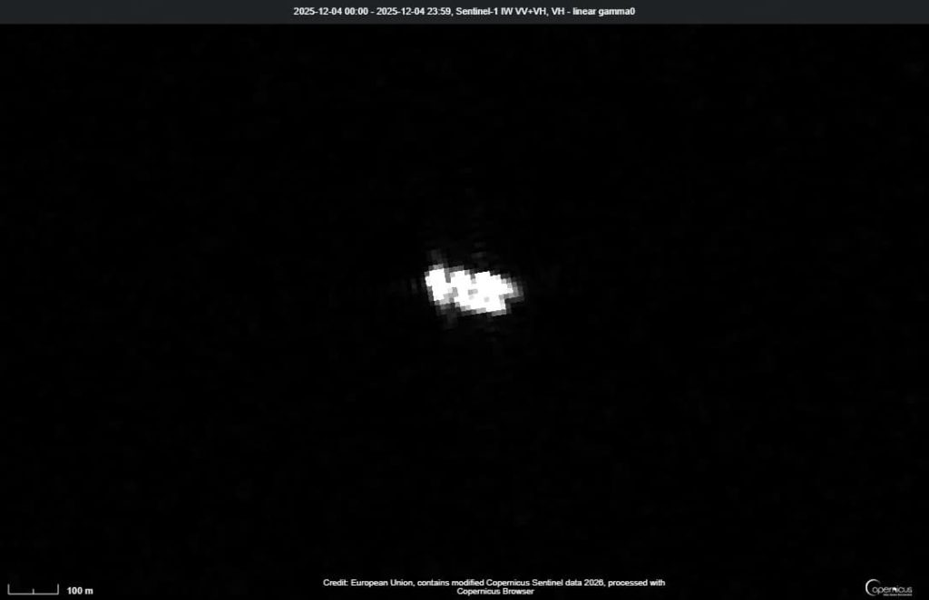 Un posibil ship-to-ship transfer surprins de radarul Santinel-1 (VH – linear gamma0) între petrolierele KOLENTE (IMO 9264271) și CLEAN RAIDER (IMO 9425318) pe 4 decembrie 2025 în ZEE a României. (Sursa: Copernicus Browser)